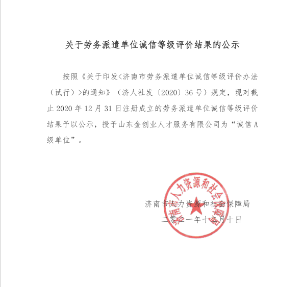 金创业公司是一家专业从事人才服务的省级人力资源服务机构,深耕劳务派遣、劳务外包、人力资源综合业务支撑服务领域近二十载,凭借专业实力与责任担当,已然成为区域行业的标杆典范。自2008年创立以来,公司始终坚守“服务人才 赢得未来”的经营理念,立足济南、服务山东,业务现已辐射广东、宁夏、安徽、江西、湖北等全国各省市。通过创新构建“专业化人才服务方案 + 多渠道招聘矩阵联动 + 多元化人力资源综合业务支撑”的三轮驱动模式,公司精心打造了覆盖党政机关、事业单位、央国企和民企的全域人才服务体系,全方位助力客户优化人力成本、增强核心竞争力。公司专业人员精英荟萃,行业积淀经验深厚,荣誉称号口碑一流,先后服务合作单位800多家,累计服务劳动者15万余名,成为客户信赖的不二之选。山东金创业,以专业铸根基、以责任促发展,与客户携手共赴美好未来。